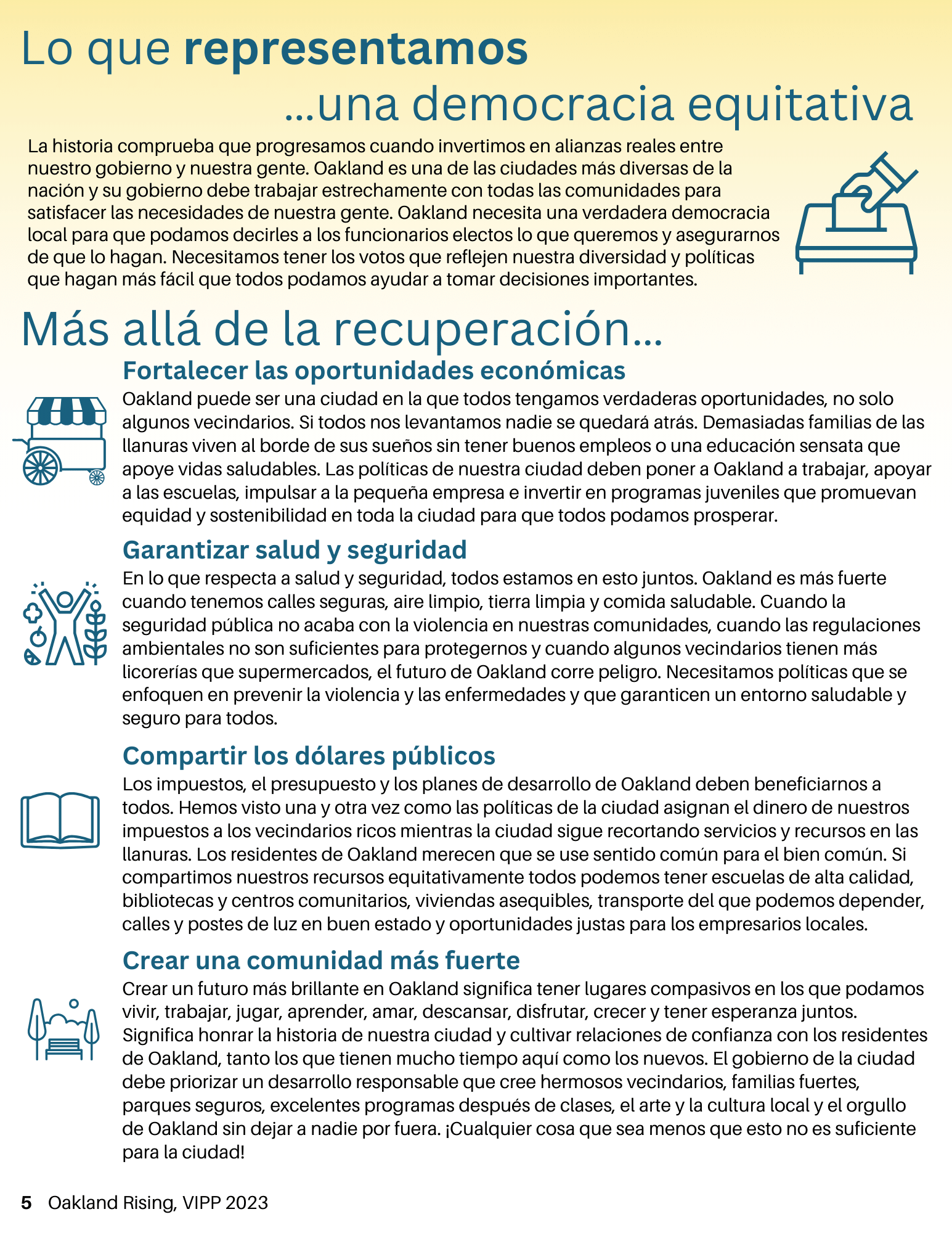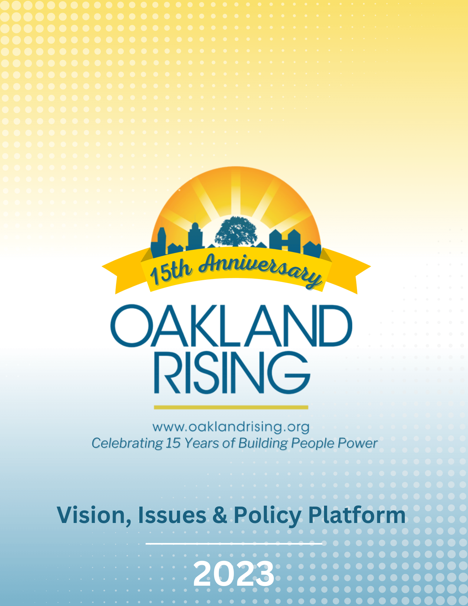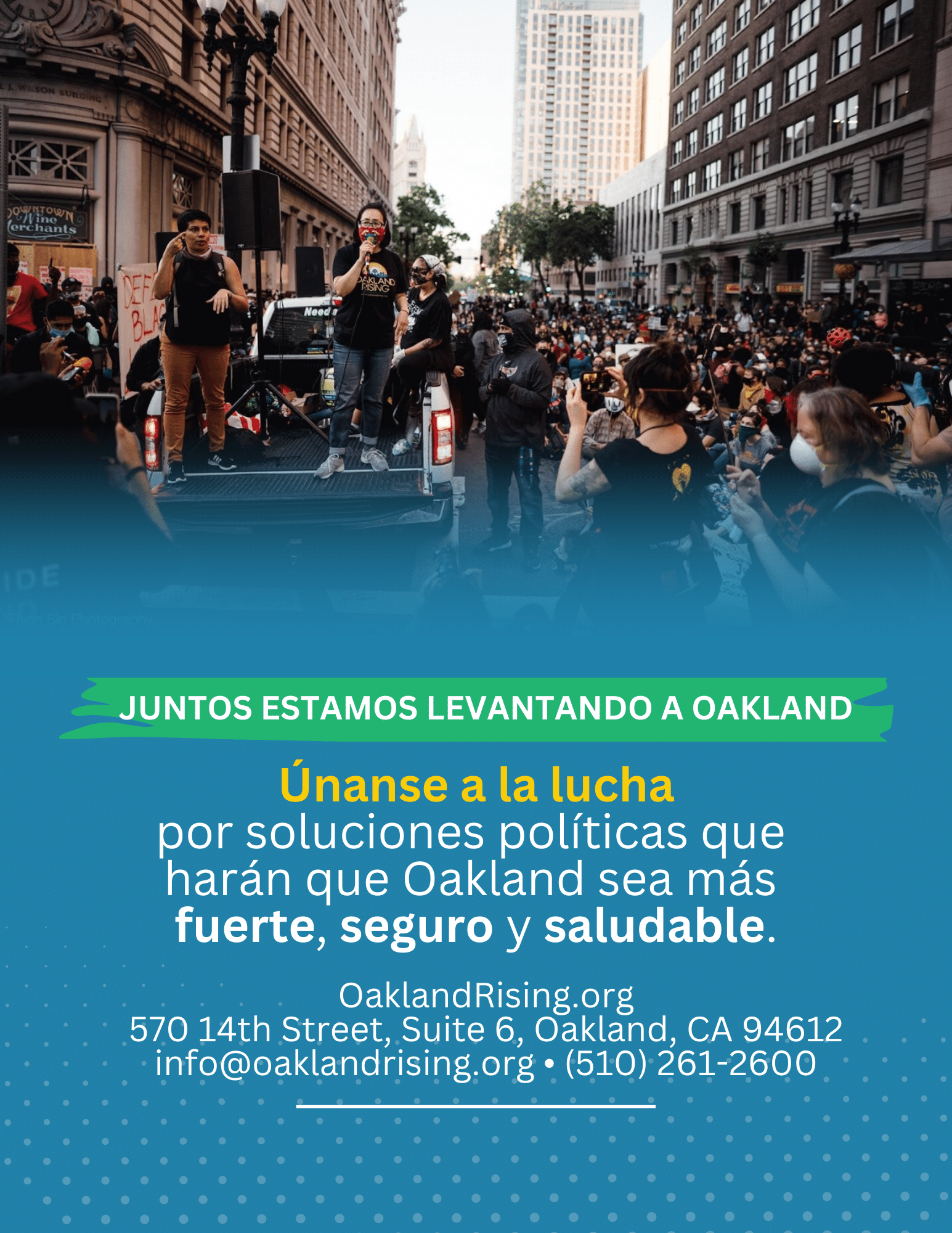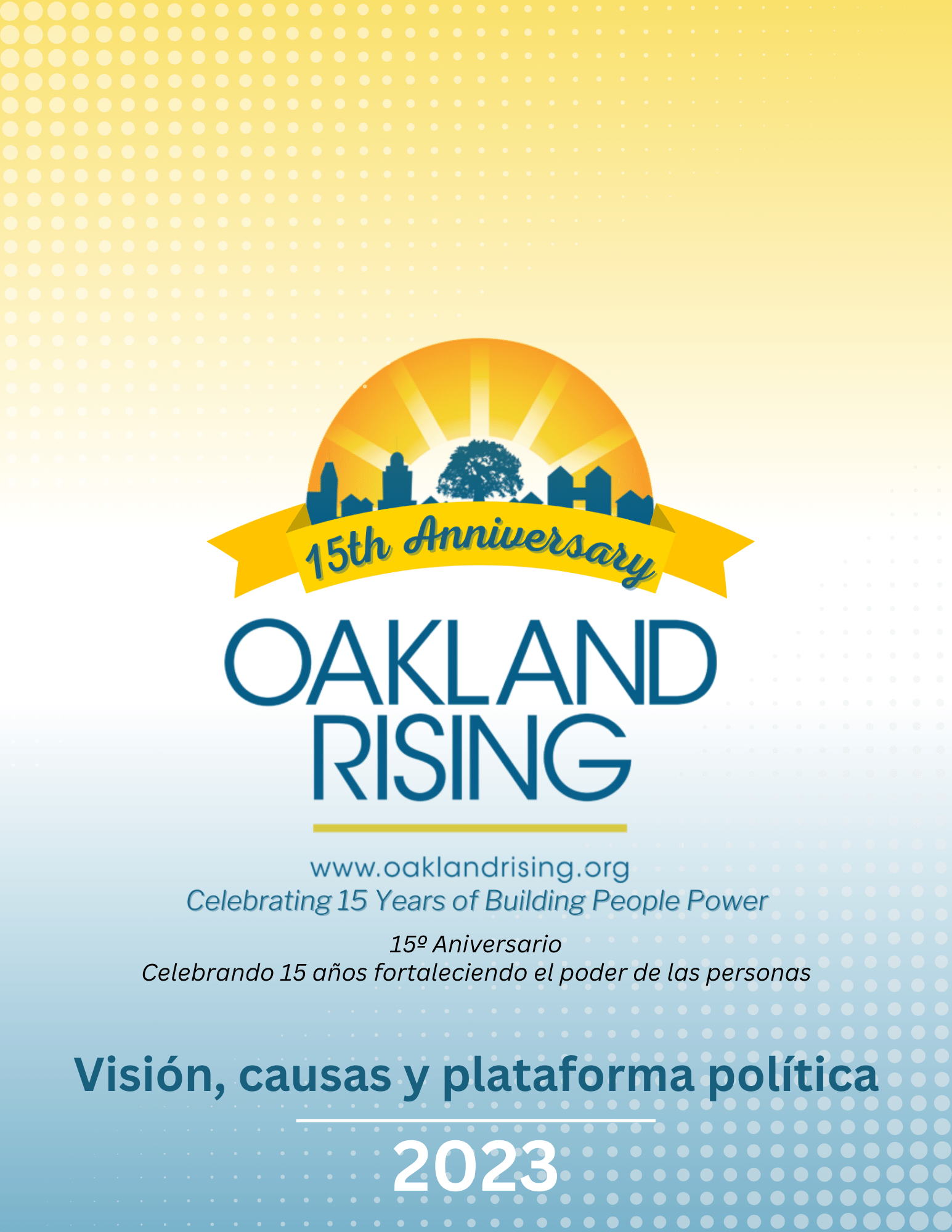Para obtener una comprensión más profunda de nuestro compromiso de resistir, proteger y avanzar en este momento político, lo invitamos a explorar nuestra Visión, Problemas y Plataforma de Políticas para 2023. Juntos, estamos avanzando hacia un Oakland más equitativo y justo, y nos mantenemos firmes en nuestra búsqueda del cambio, un voto, una reunión, una marcha a la vez.