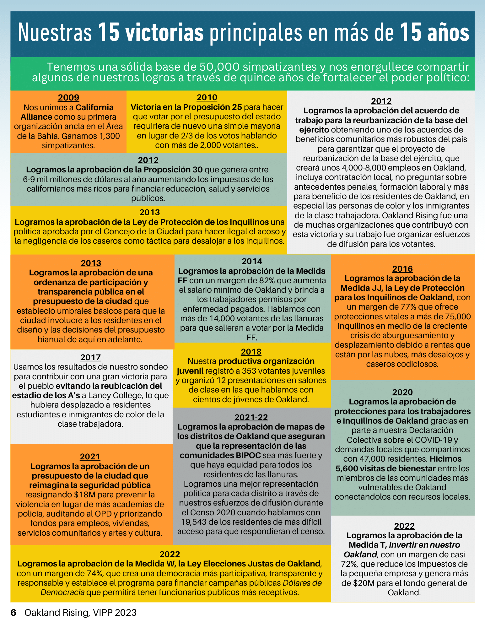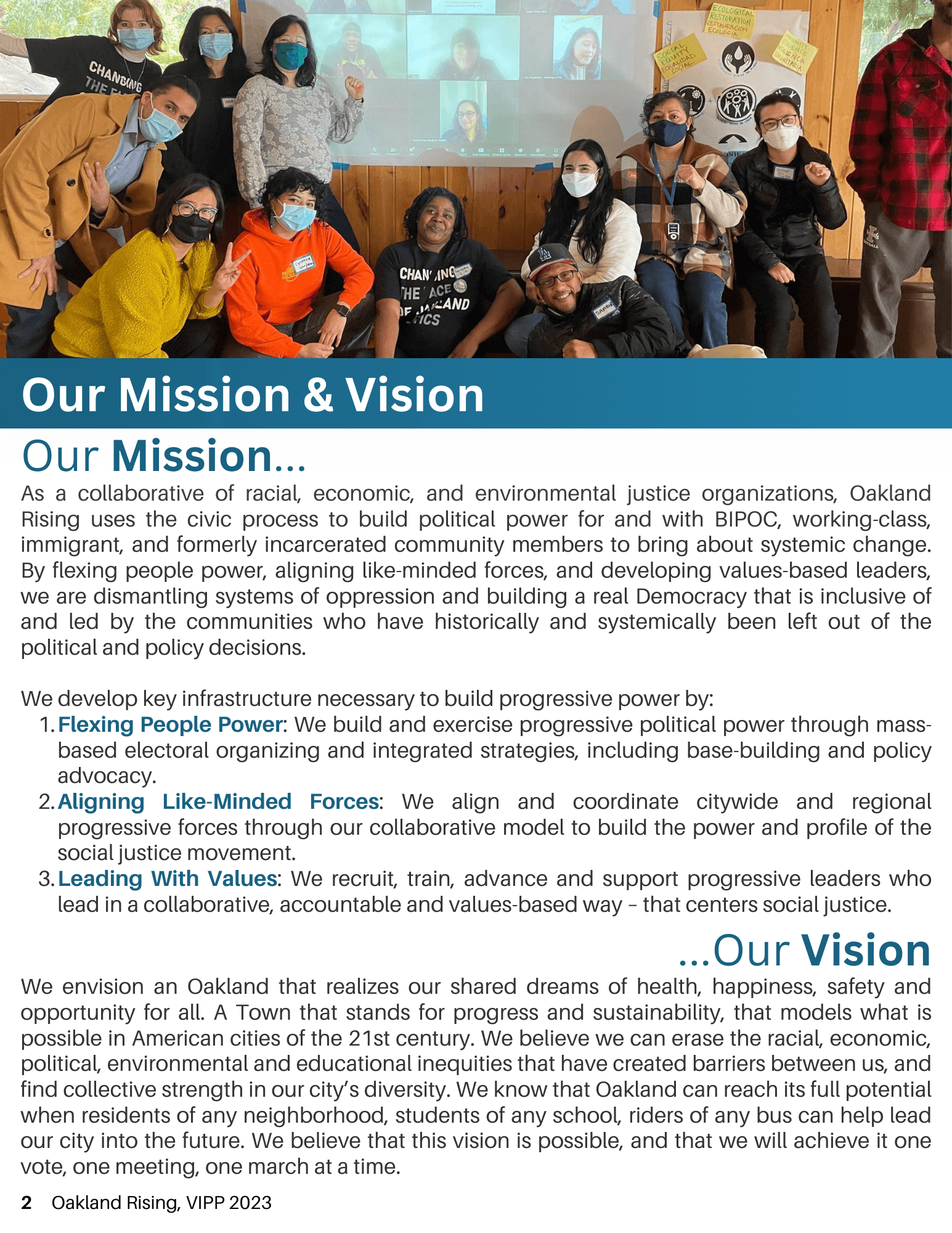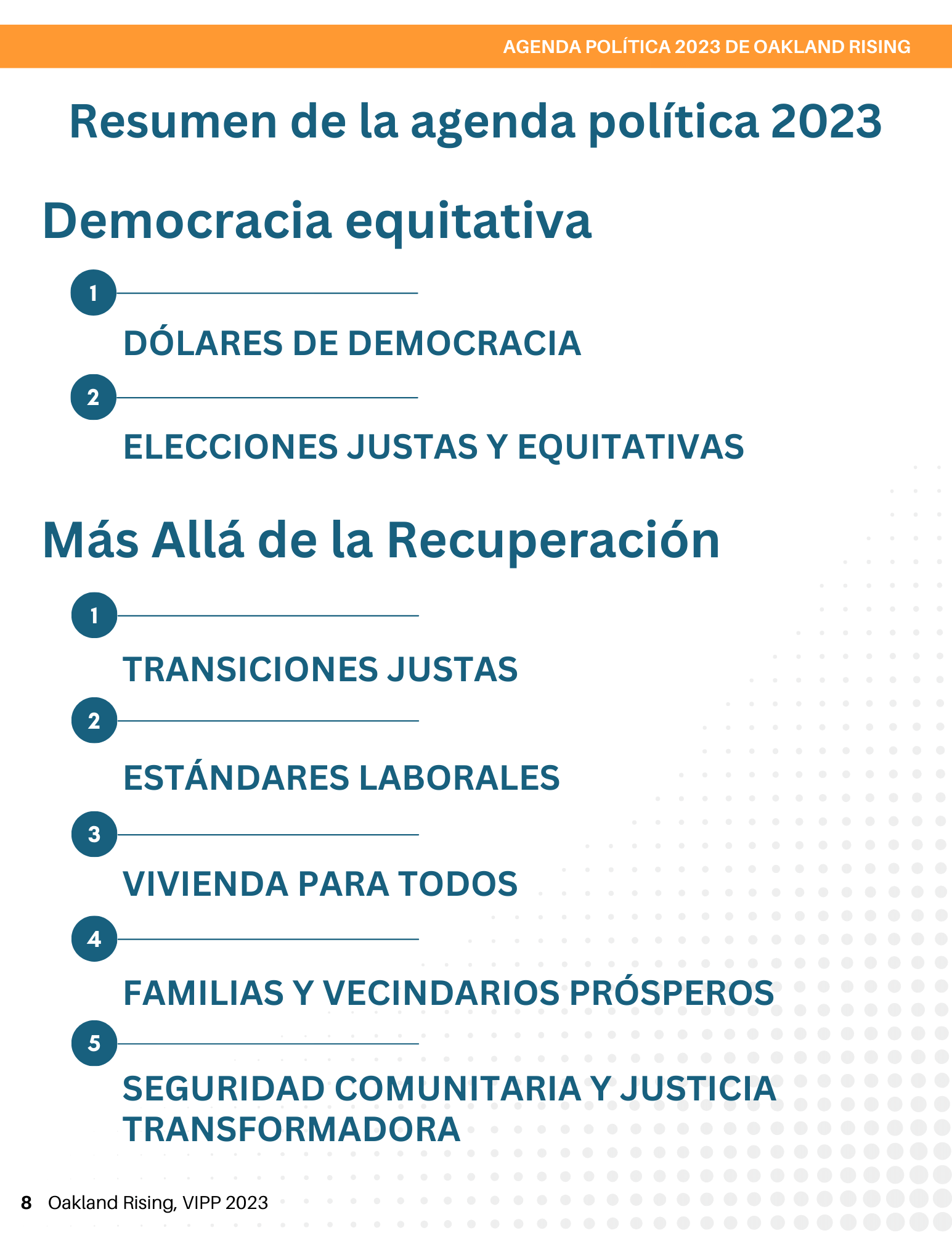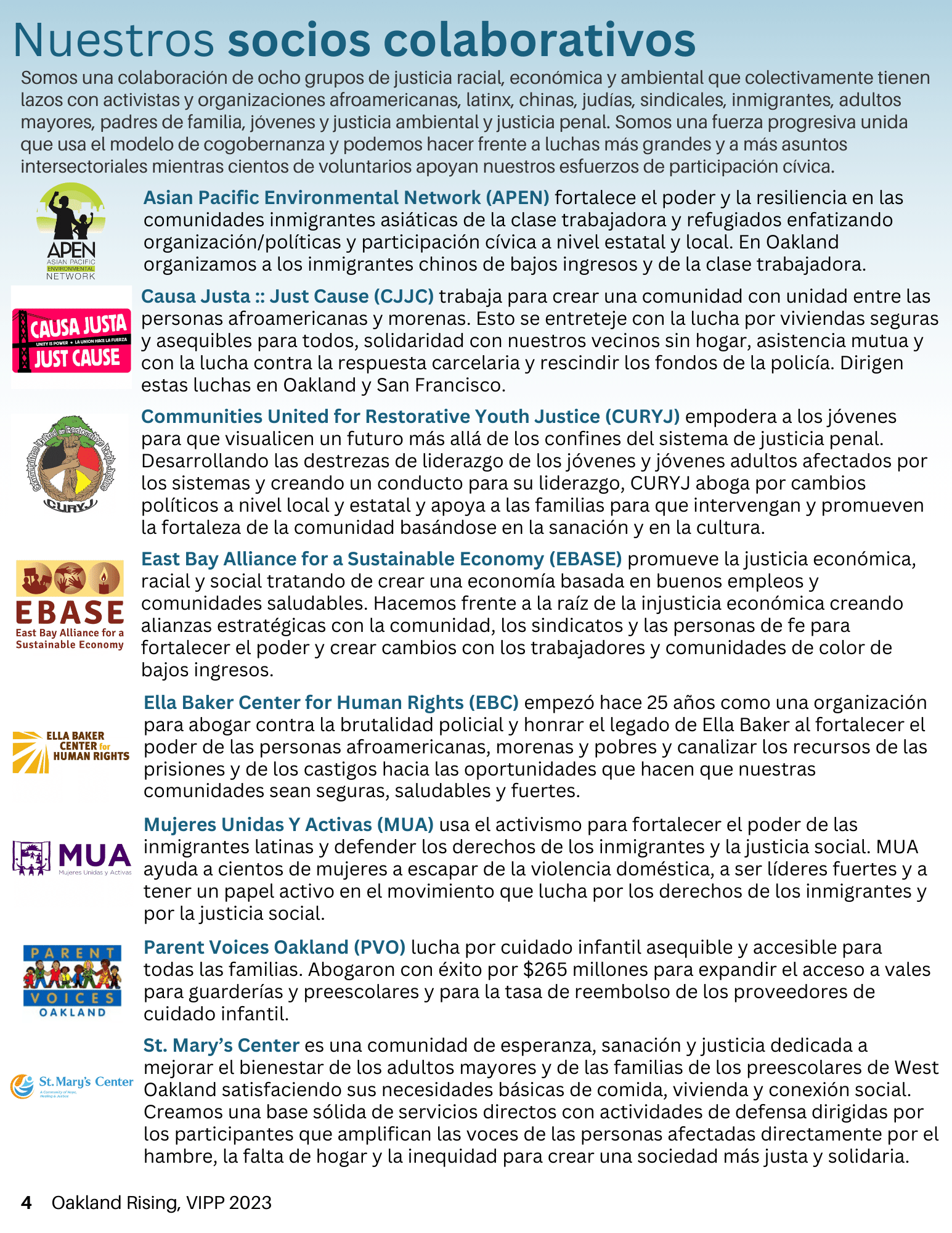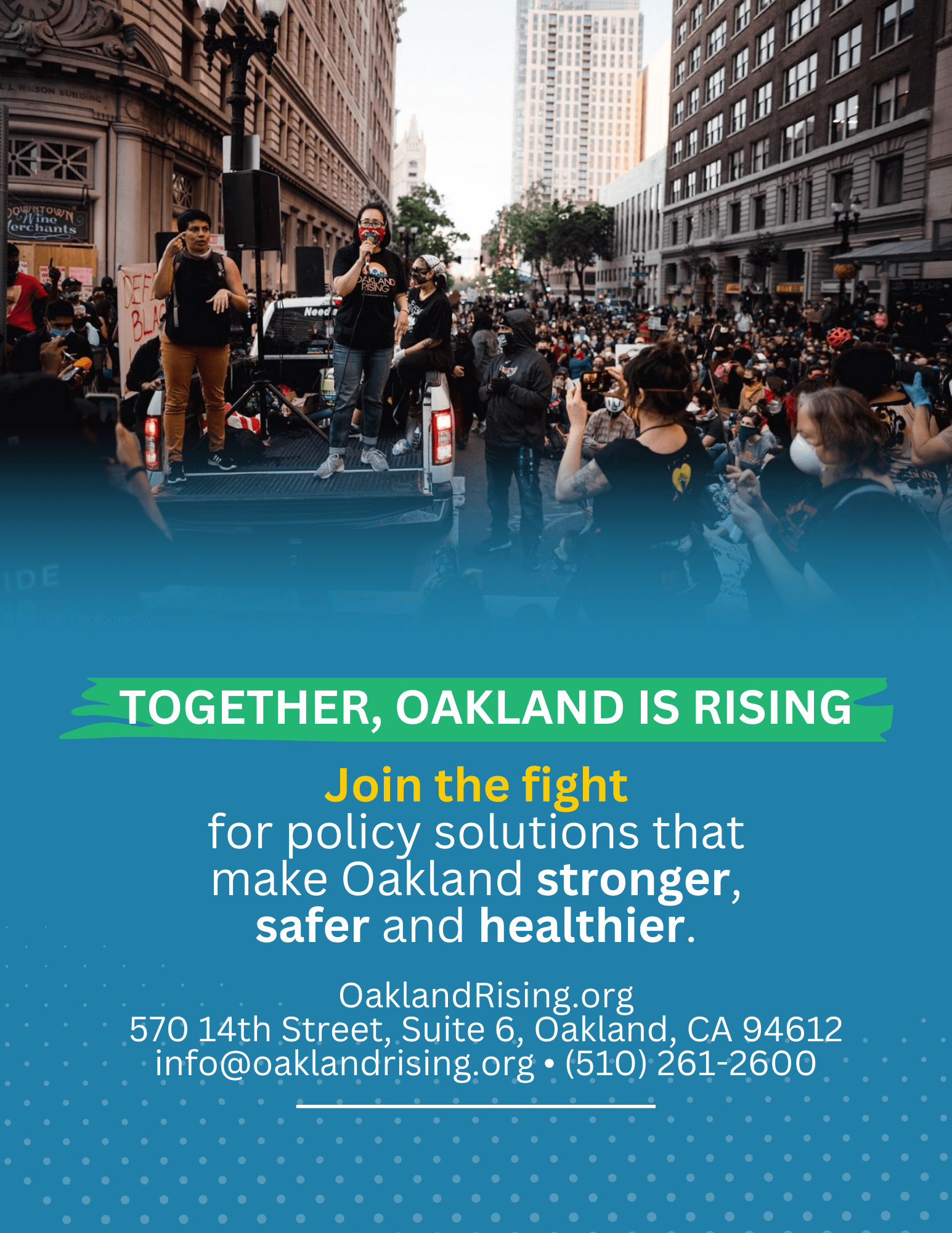 Para obtener una comprensión más profunda de nuestro compromiso de resistir, proteger y avanzar en este momento político, lo invitamos a explorar nuestra Visión, Problemas y Plataforma de Políticas para 2023. Juntos, estamos avanzando hacia un Oakland más equitativo y justo, y nos mantenemos firmes en nuestra búsqueda del cambio, un voto, una reunión, una marcha a la vez.