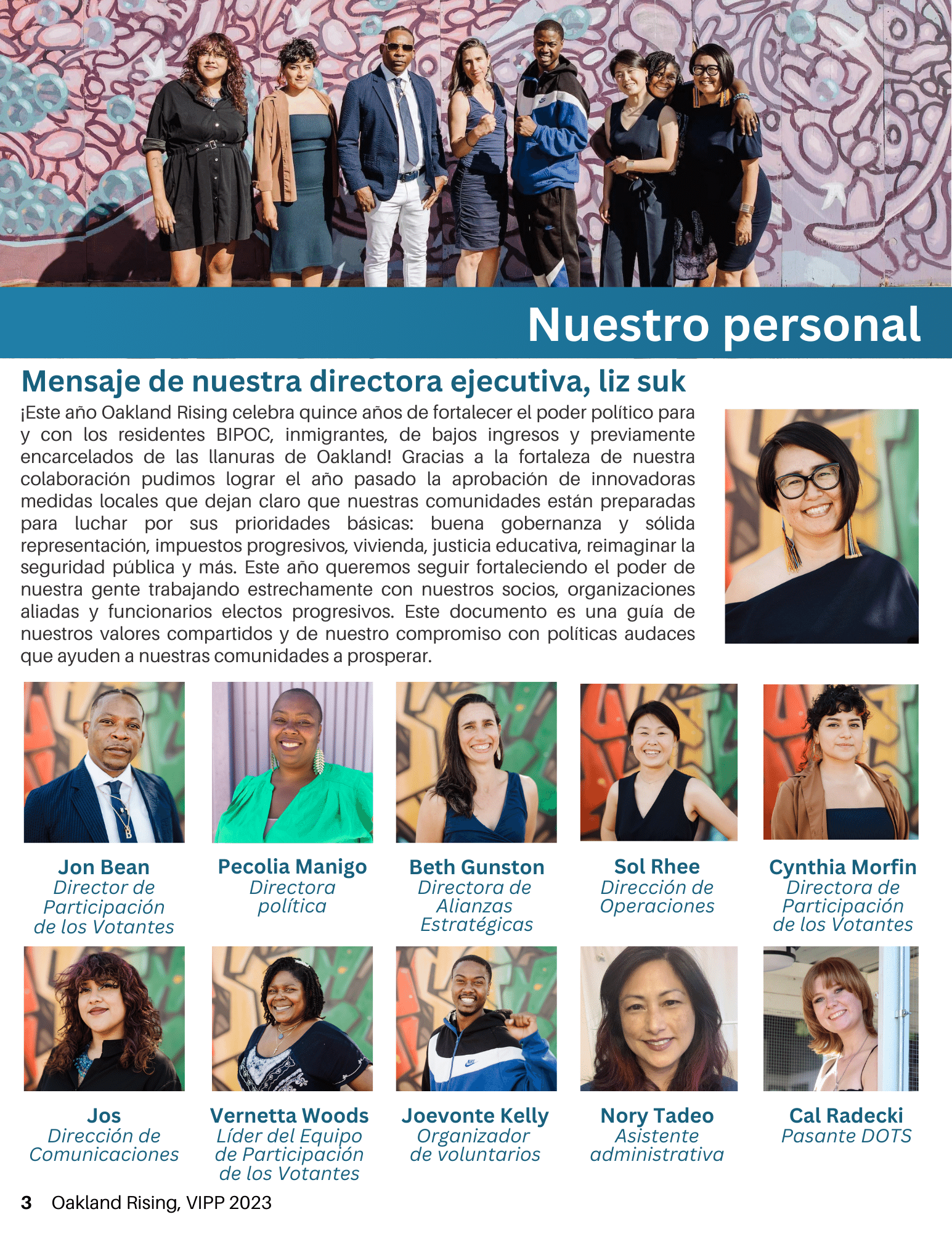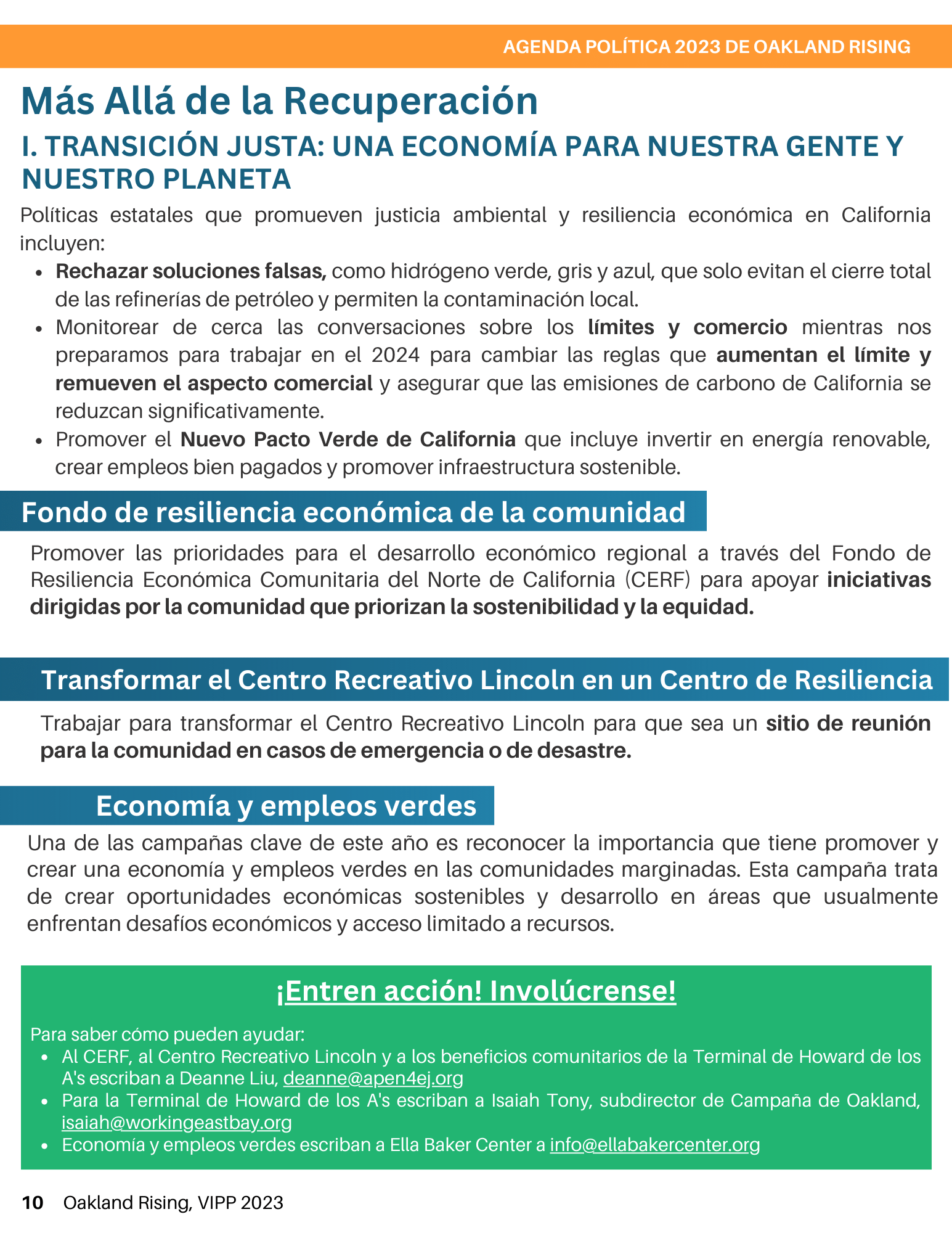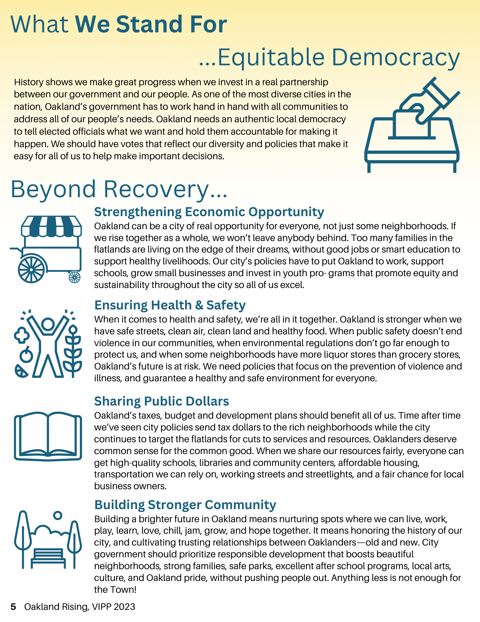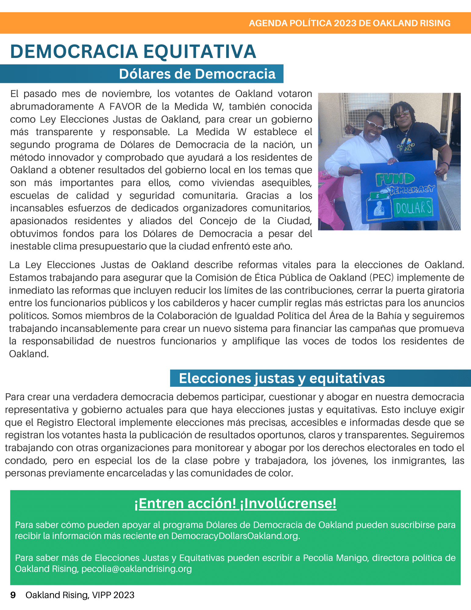Para obtener una comprensión más profunda de nuestro compromiso de resistir, proteger y avanzar en este momento político, lo invitamos a explorar nuestra Visión, Problemas y Plataforma de Políticas para 2023. Juntos, estamos avanzando hacia un Oakland más equitativo y justo, y nos mantenemos firmes en nuestra búsqueda del cambio, un voto, una reunión, una marcha a la vez.