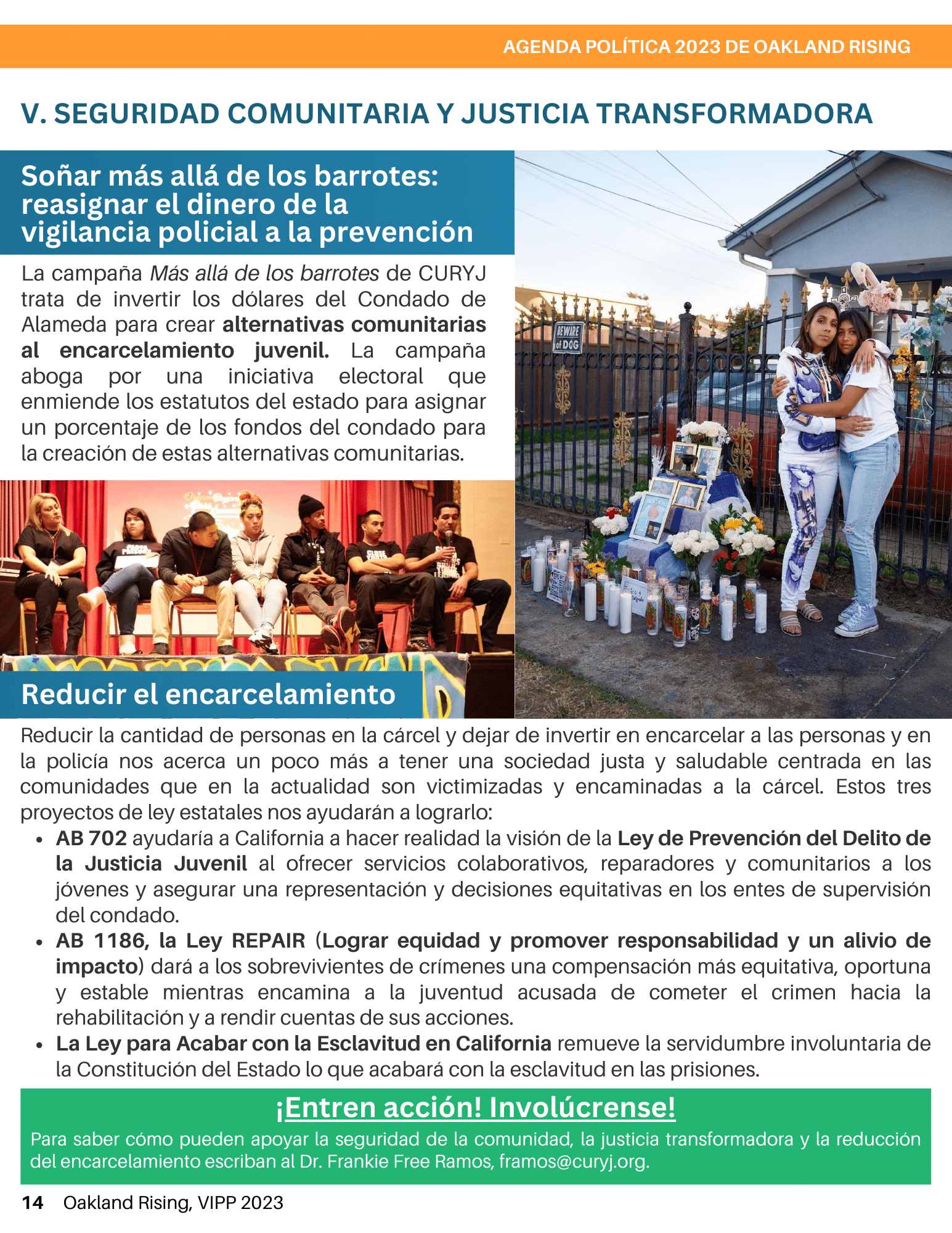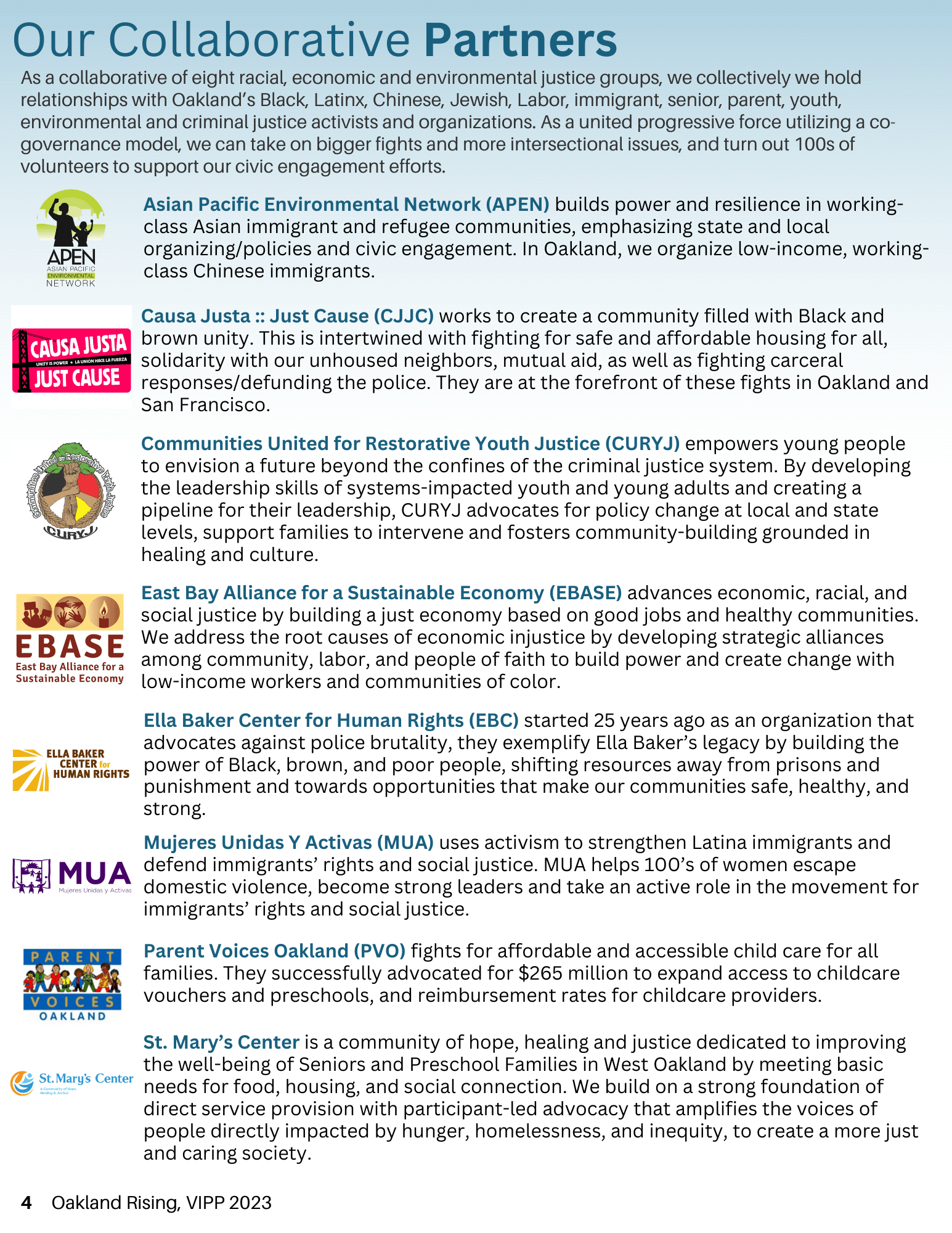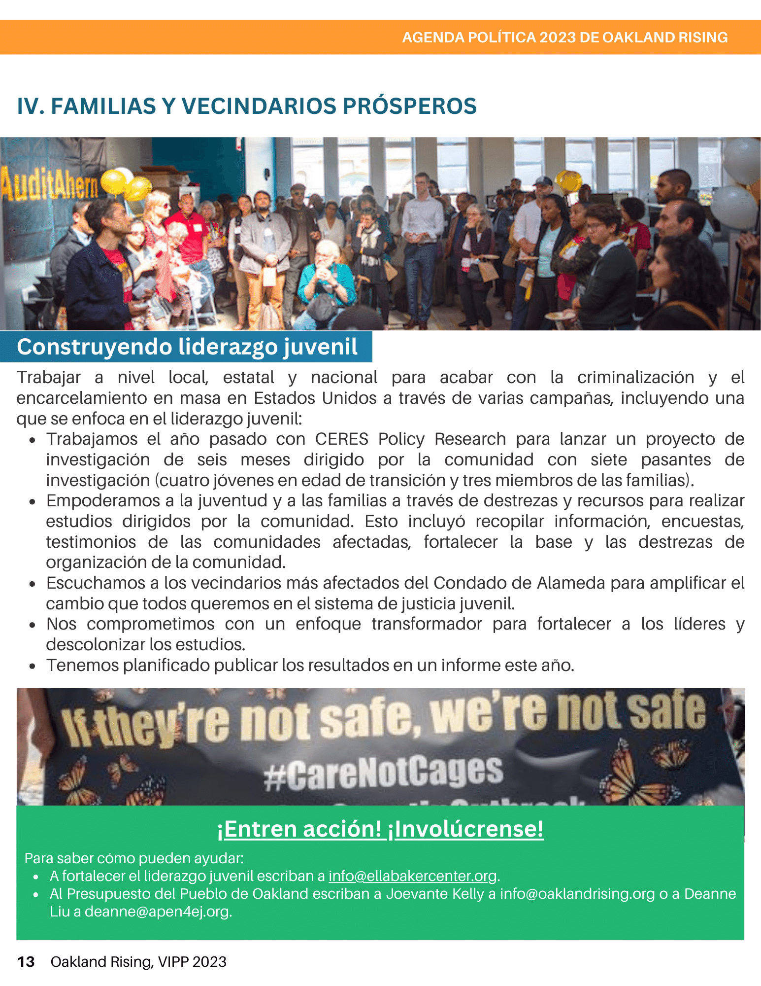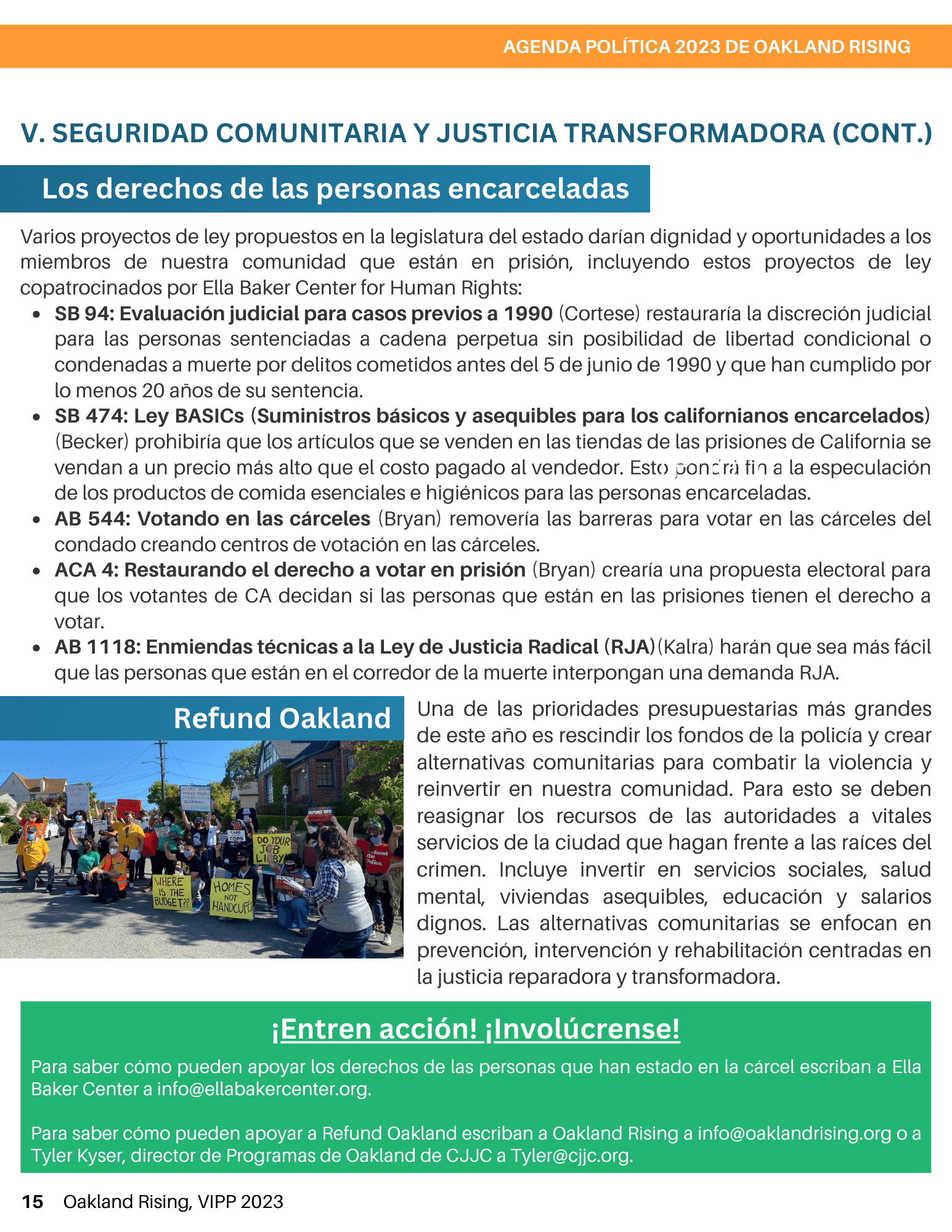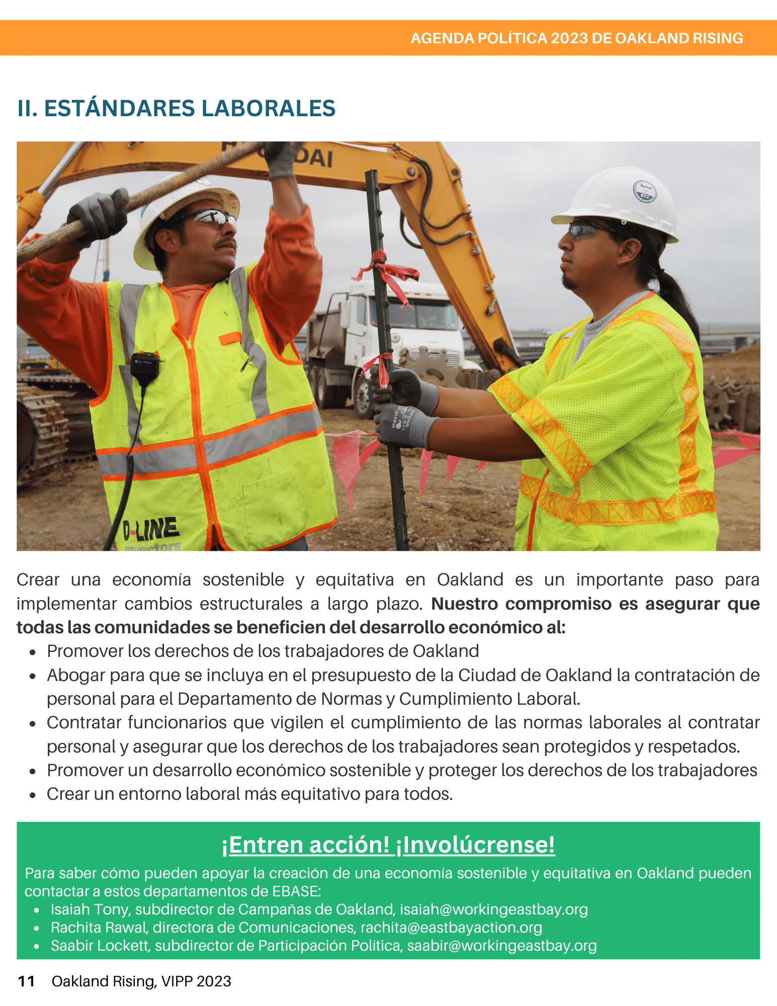 Para obtener una comprensión más profunda de nuestro compromiso de resistir, proteger y avanzar en este momento político, lo invitamos a explorar nuestra Visión, Problemas y Plataforma de Políticas para 2023. Juntos, estamos avanzando hacia un Oakland más equitativo y justo, y nos mantenemos firmes en nuestra búsqueda del cambio, un voto, una reunión, una marcha a la vez.