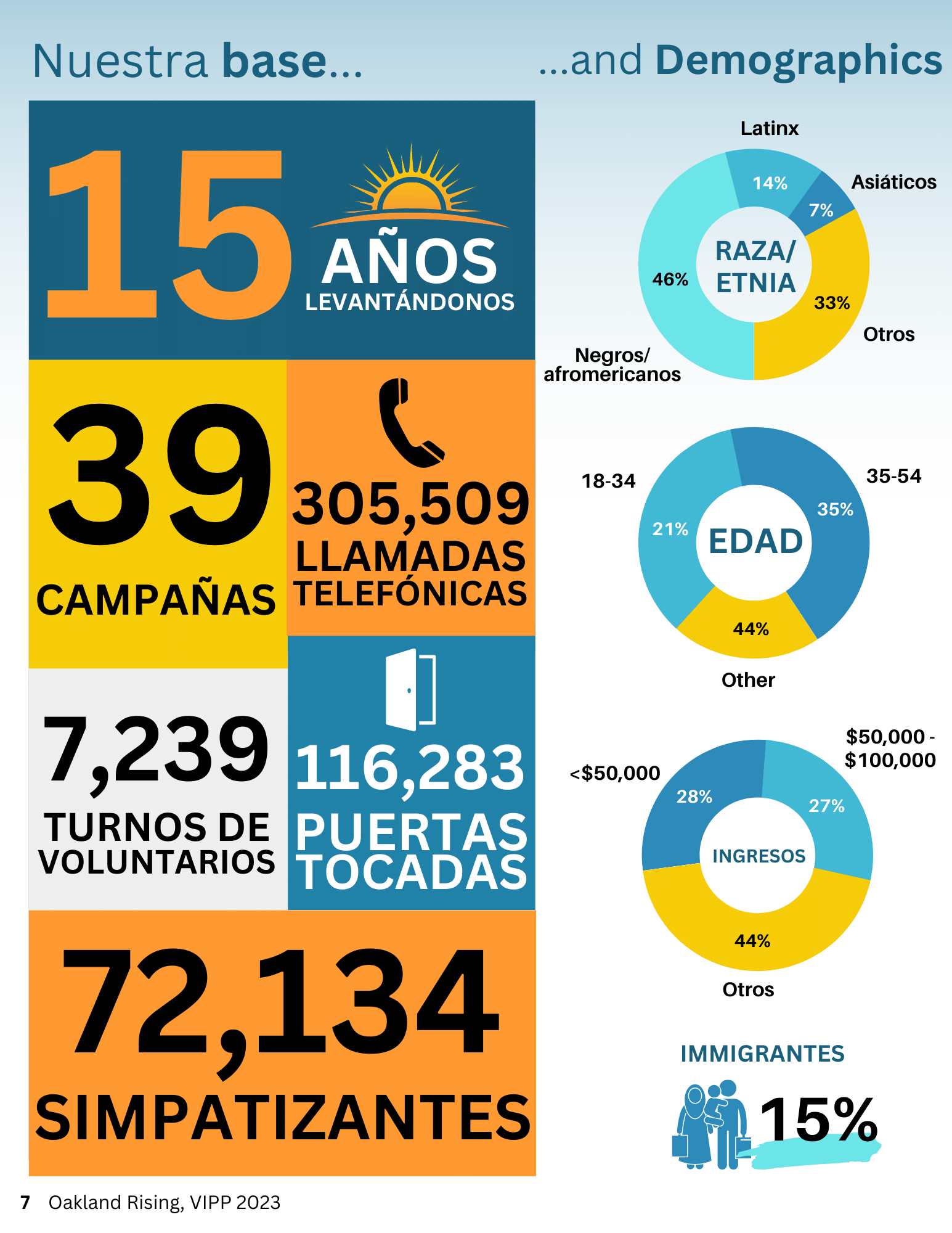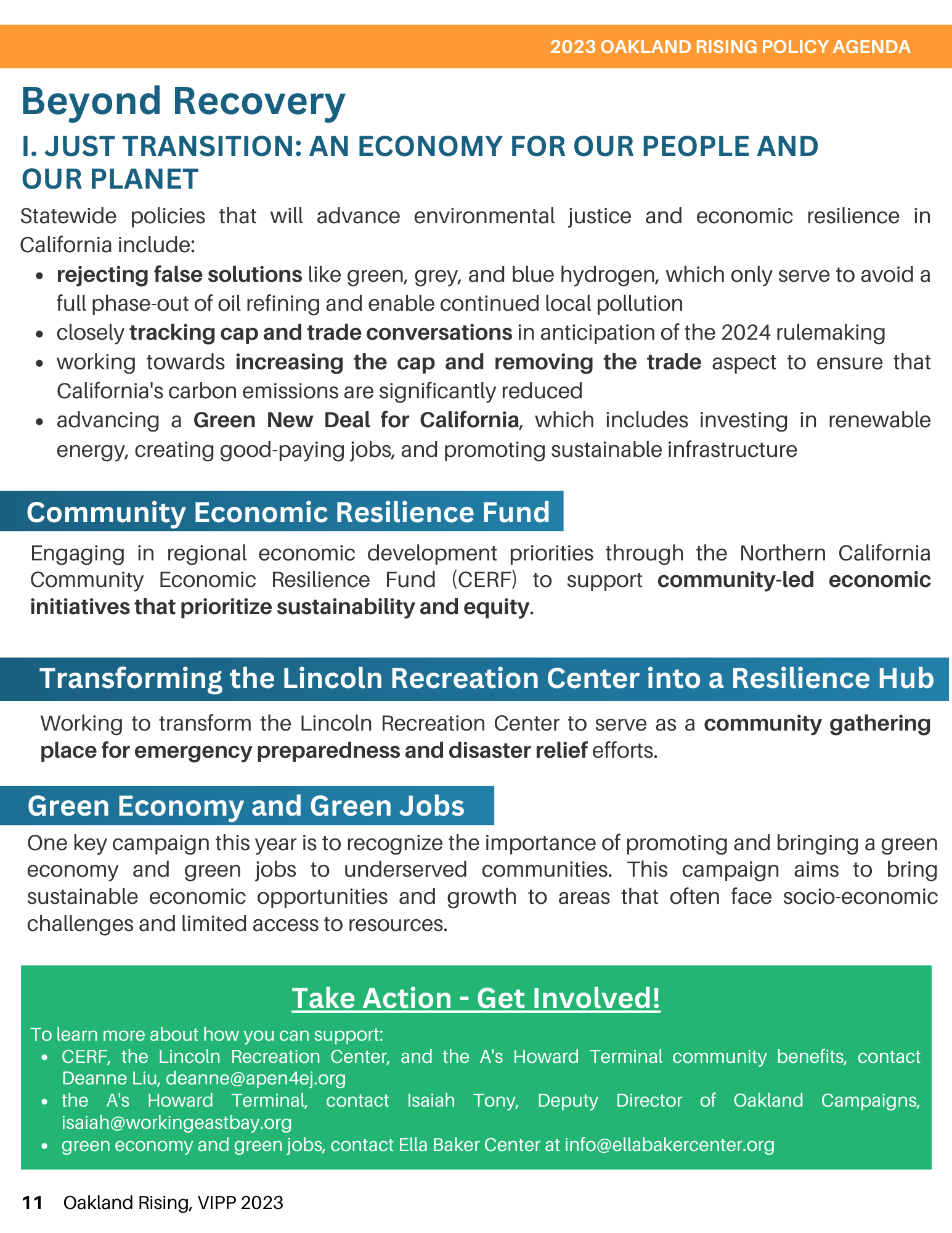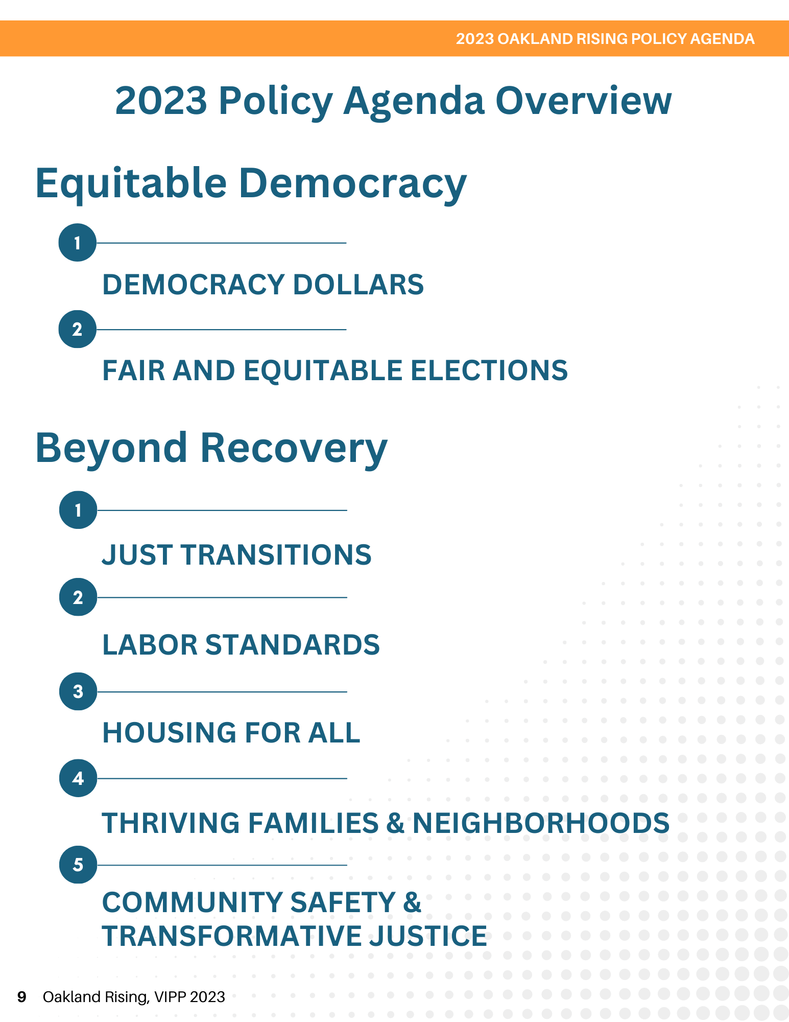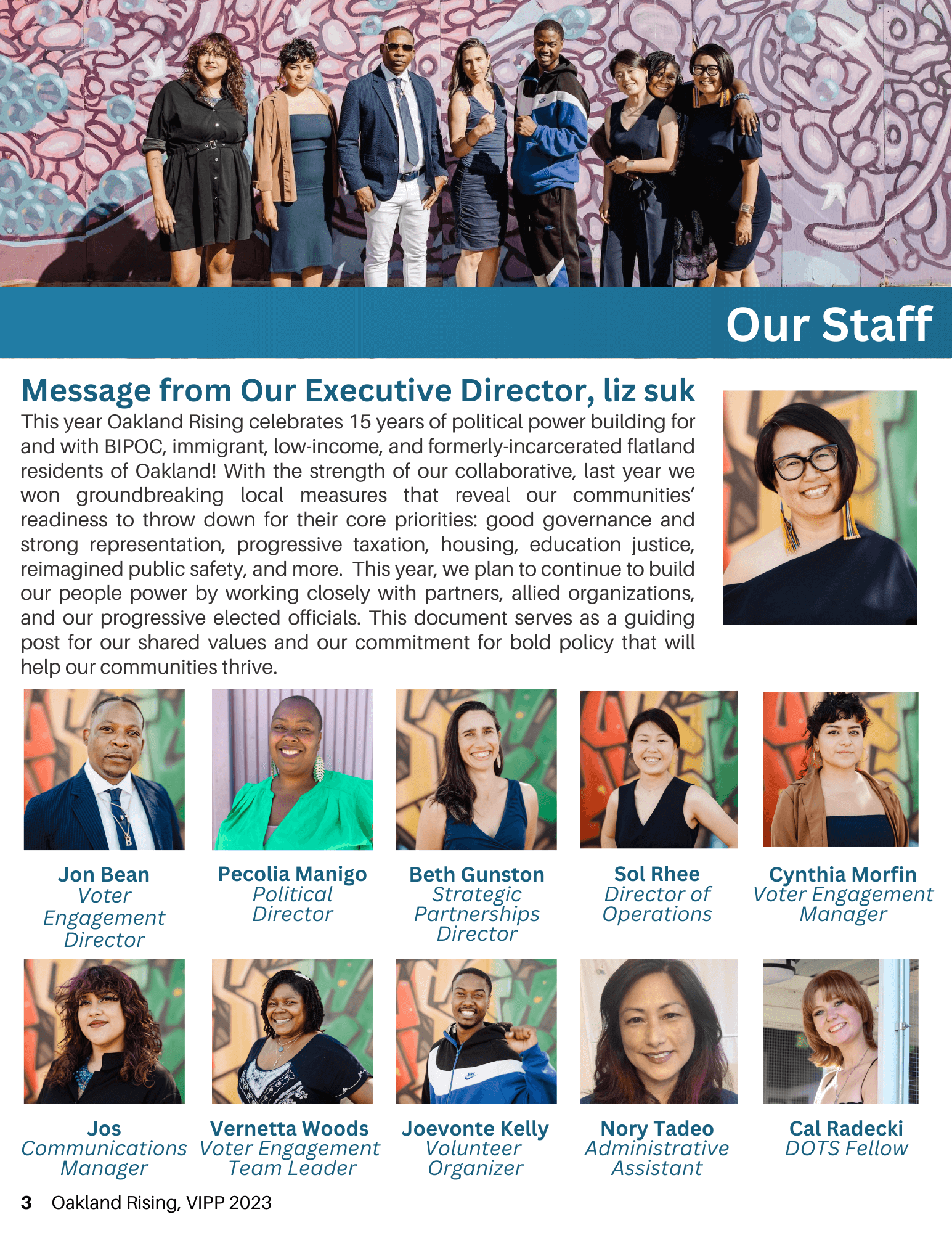 Para obtener una comprensión más profunda de nuestro compromiso de resistir, proteger y avanzar en este momento político, lo invitamos a explorar nuestra Visión, Problemas y Plataforma de Políticas para 2023. Juntos, estamos avanzando hacia un Oakland más equitativo y justo, y nos mantenemos firmes en nuestra búsqueda del cambio, un voto, una reunión, una marcha a la vez.