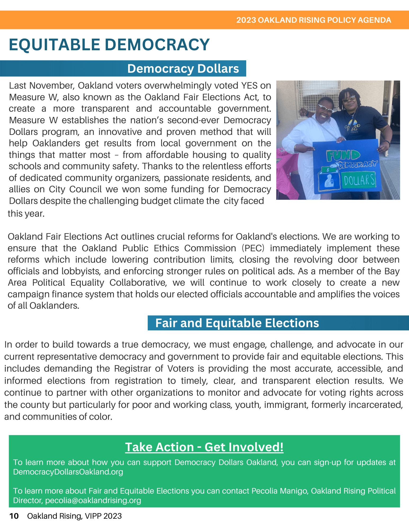 To gain a deeper understanding of our commitment to resist, protect, and advance in this political moment, we invite you to explore our 2023 Vision, Issues, and Policy Platform. Together, we are making strides towards a more equitable and just Oakland, and we remain steadfast in our pursuit of change, one vote, one meeting, one march at a time.