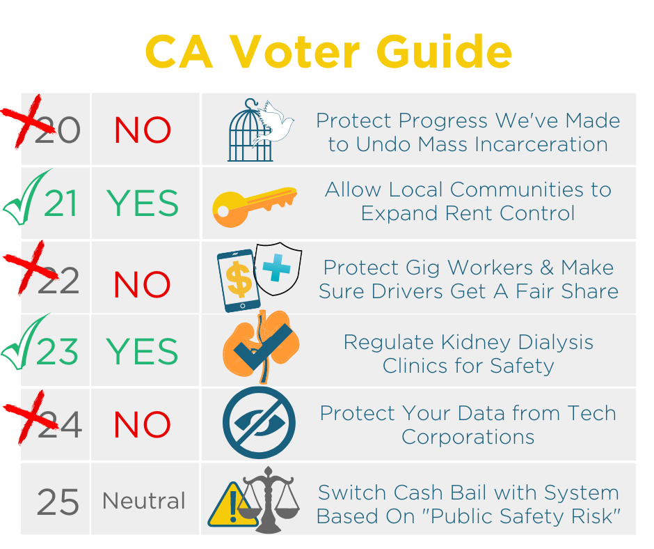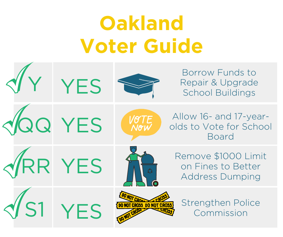 Check out and share our extensive voter guide that covers Oakland and Alameda County Measures, as well as State Propositions. Our endorsements prioritize advancing us towards a more progressive California that centers our working-class, immigrant, communities of color and brings back funding to our schools, parks, health centers, city services and most importantly – our wellbeing, our voter guide. Funding for our communities equals reinvesting in a prosperous future for all of us. Click on each voter guide to see a longer description and analysis.
